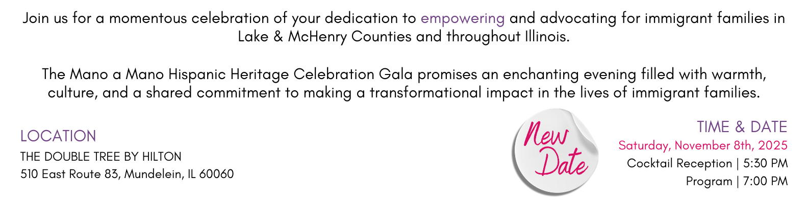 Founded in 2000, Mano a Mano's mission is to empower immigrant families to become full participants in their community. Our vision is an integrated community where everyone has access to opportunities and pathways to success. Serving Lake and McHenry Counties, Mano a Mano is located in Round Lake Park, with a satellite office in North Chicago and community sites around Lake County.